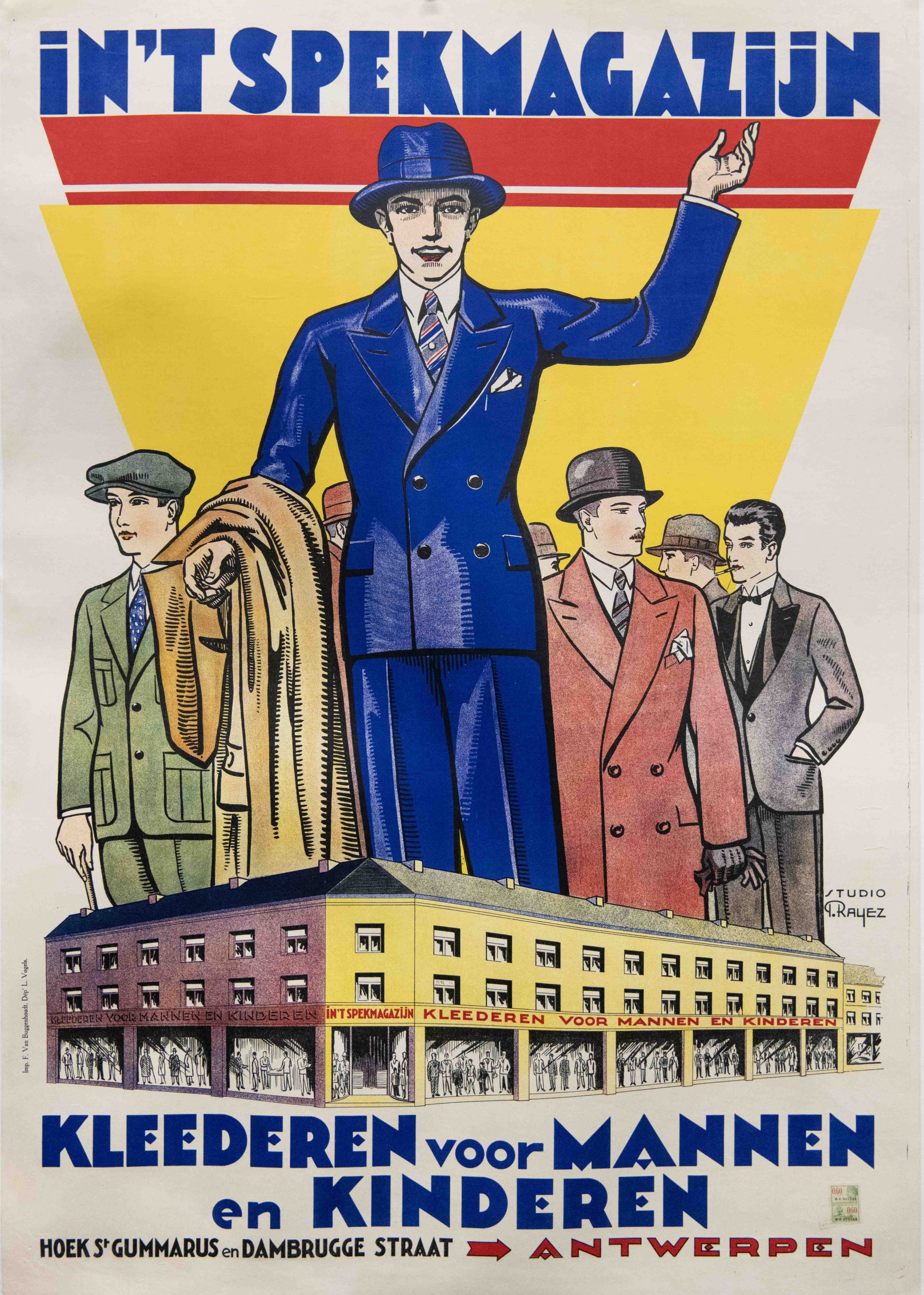 This advertisement is for a Men’s/Children’s Department store in Antwerpen (Antwerp). Pictured is a man in a dark blue tuxedo, with other’s behind him in other fancy suits.