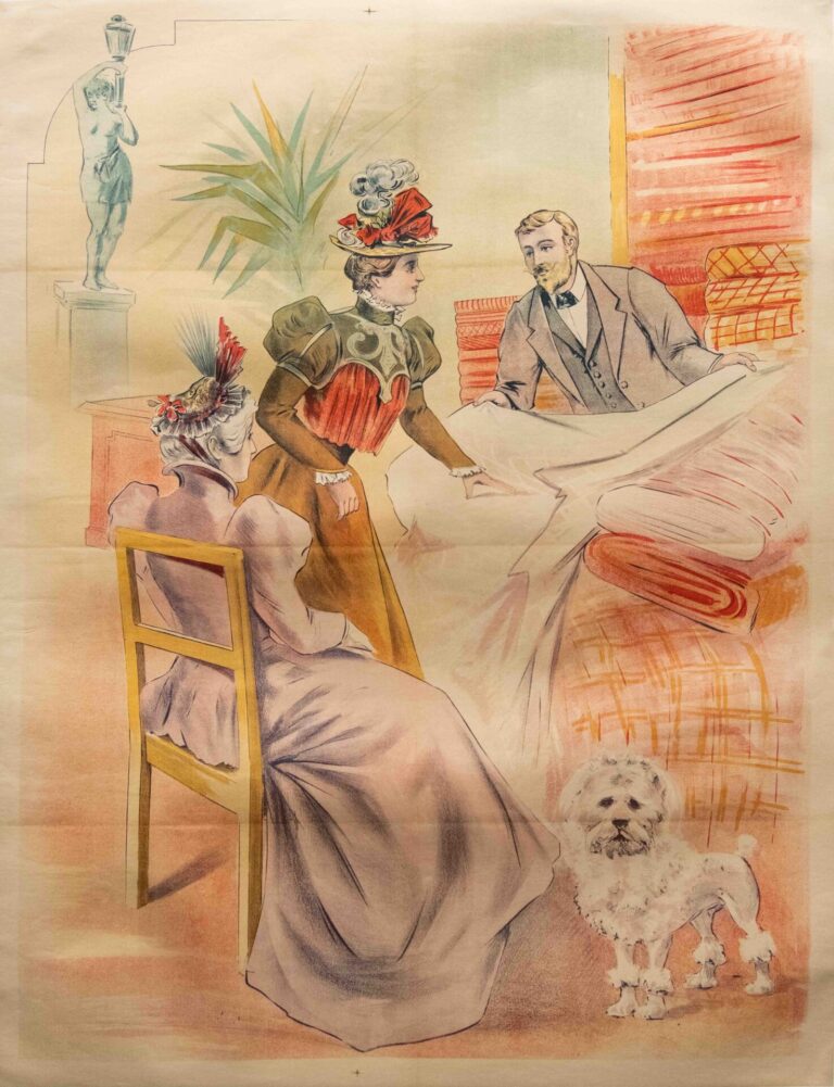 Advertising poster for a white sale in a department store. Notice the salesperson introducing the fine linens to 2 eloquent ladies, one seated on the left, and one in the center caressing the fabric. The white French Poodle stands patiently behind them.